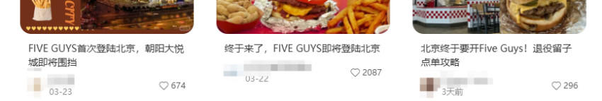近期,有不少网友在社交平台发帖称,来自美国的高端汉堡品牌Five Guys首次进入北京市场,并于朝阳大悦城开出门店。另据北京商报报道,Five Guys确实将北京市场开店,开业时间预计在三季度。