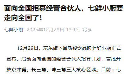 红餐网消息,12月29日,京东旗下餐饮品牌七鲜小厨发文称,正式面向全国招募经营合伙人,引发行业关注。