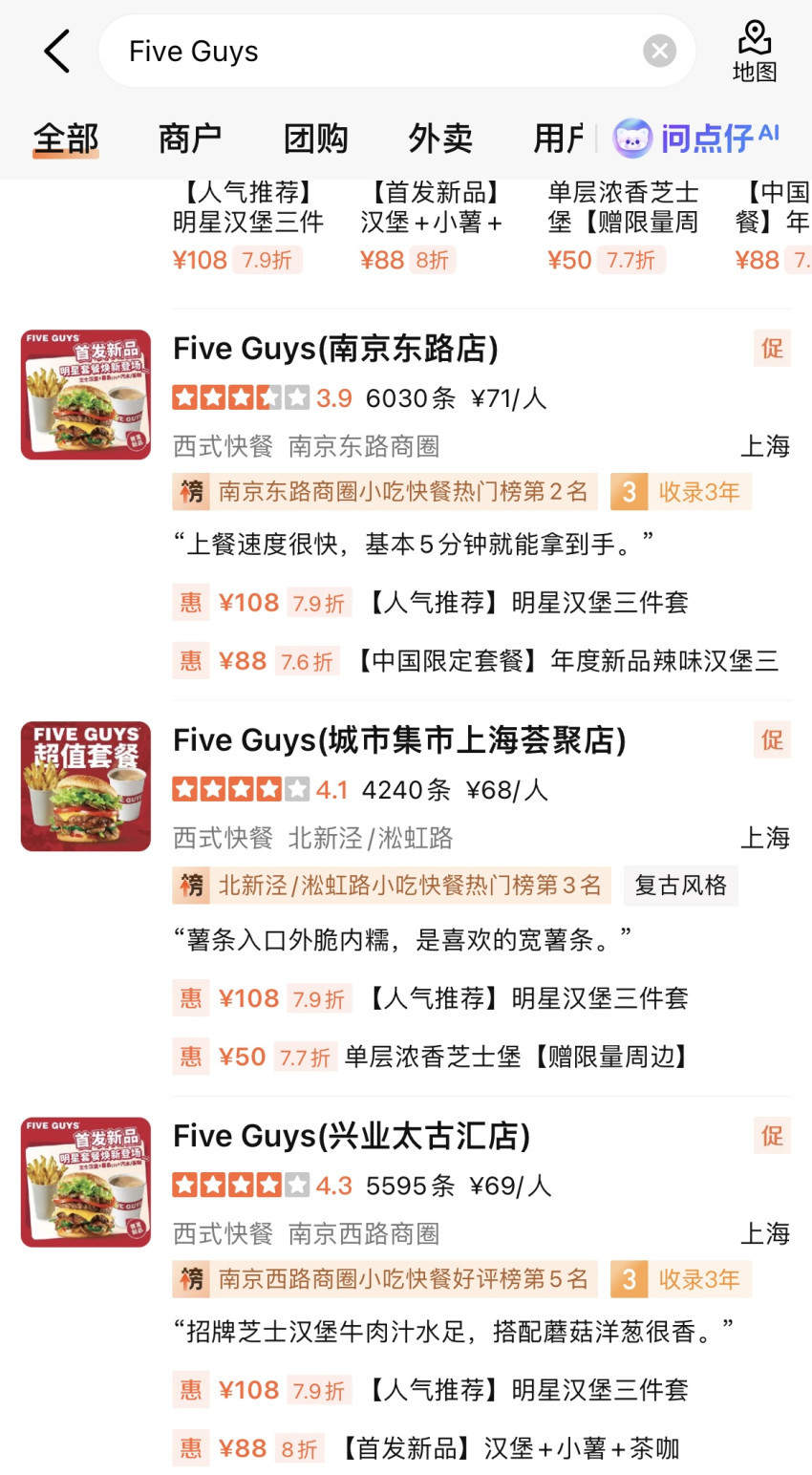 尽管扩张缓慢,但Five Guys在上海颇受消费者青睐。大众点评显示,其5家门店均成功被收录至所在商圈的相关美食榜,其中其南京东路店更是位列“南京东路商圈小吃快餐热门榜第2名”,好评不断。