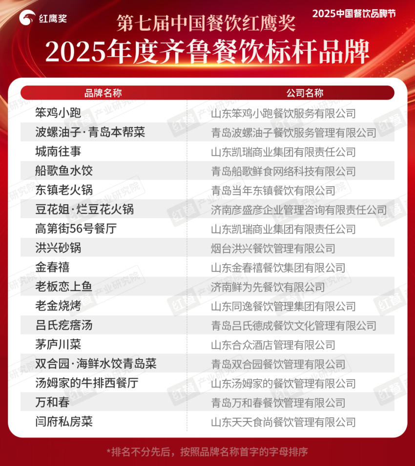 2025年9月25日,“第七届中国餐饮红鹰奖”榜单正式公布!“2025年度餐饮区域标杆品牌”作为“第七届中国餐饮红鹰奖”重要奖项之一,在上届的基础上进行了升级,对区域标杆品牌进行了更为系统、精细的分类细化,将评选的区域数量从上一届的15个拓展至20个,精准覆盖全国大部分省市及特色餐饮聚集区,力求全面挖掘不同地域的餐饮特色标杆。其中,“2025年度齐鲁餐饮标杆品牌”有17个品牌上榜。