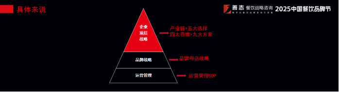 企业不论大小,都要有顶层战略思维。企业顶层战略非常重要,是现场在座的一把手应该思考的问题。餐饮老板要思考企业未来发终极目标,思考企业未来要走向何方,要思考企业未来三年、十年该怎么干。