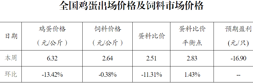 10月13日,据国家发改委公布,本周全国蛋料比价为2.51,较节前一周下跌11.31%。按目前价格及成本推算,未来蛋鸡养殖每只亏损16.90元。