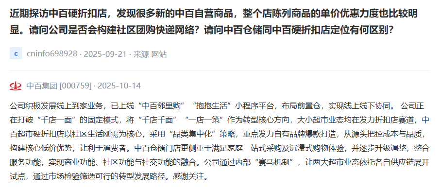 中百集团表示,公司正在打破“千店一面”的固定模式,将“千店千面”“一店一策”作为转型核心方向,大小超市业态均发力折扣店赛道。(DONEWS)