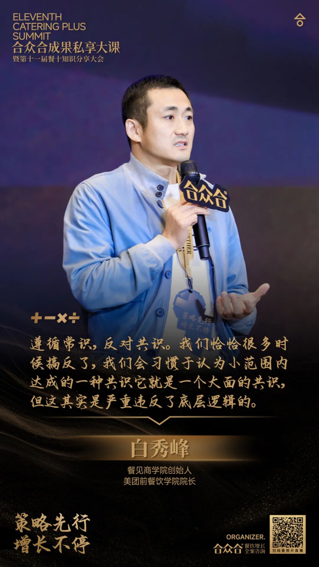 非常感动很多朋友大老远过来对合众合支持。合众合发展到现今十一年,也不是我一个人的努力,是我们整个团队,我们深度研究餐饮,在做餐饮过程中给到大家启发。今天的分享,前面的部分是总结一下我的课程,我这个课上了很久,在座的很多人都上过,感谢你们还愿意花钱来听一个大会的课,重要的还是对我们的信任。