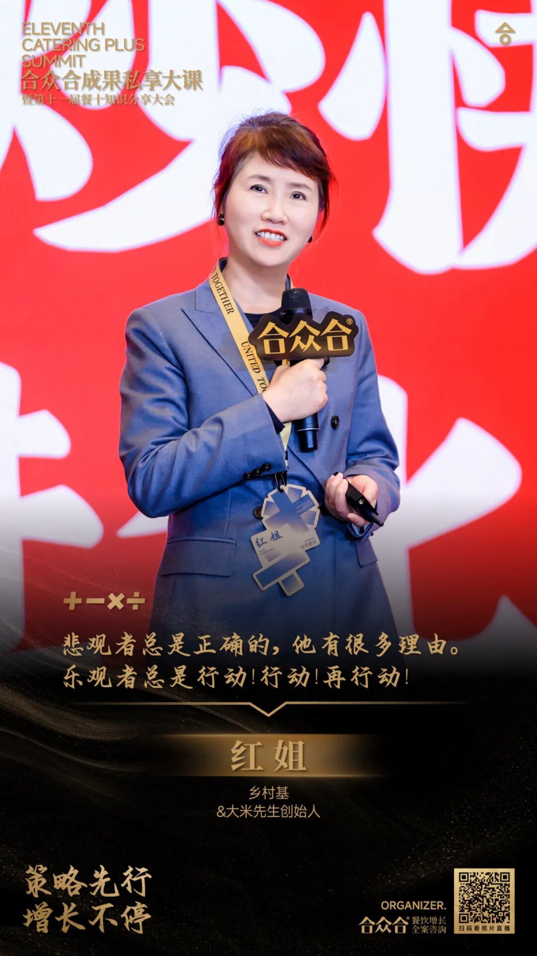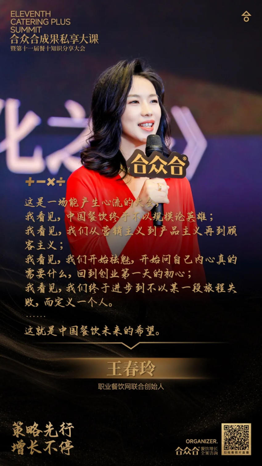 我也非常感谢春玲,今天的主持人,她人品很好,去年大会我们停电了半小时,她一个人在台上黑灯瞎火主持了半小时。我觉得做朋友不是今天你厉不厉害,是不是老板,有没有钱,有没有地位,都不重要。我的朋友我只认价值观,我也希望所有的朋友能够持续见证合众合的发展。也感谢合众合所有的团队,感谢所有的客户,还有我们共同做的餐饮事业,谢谢大家!