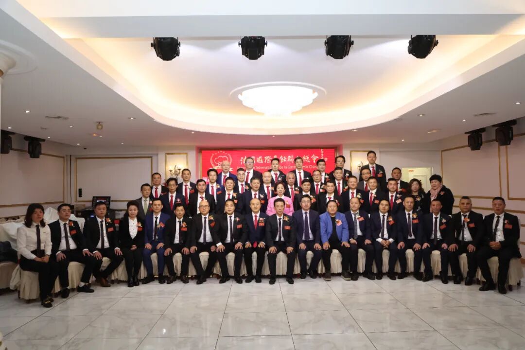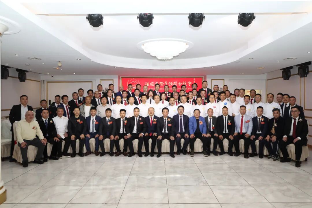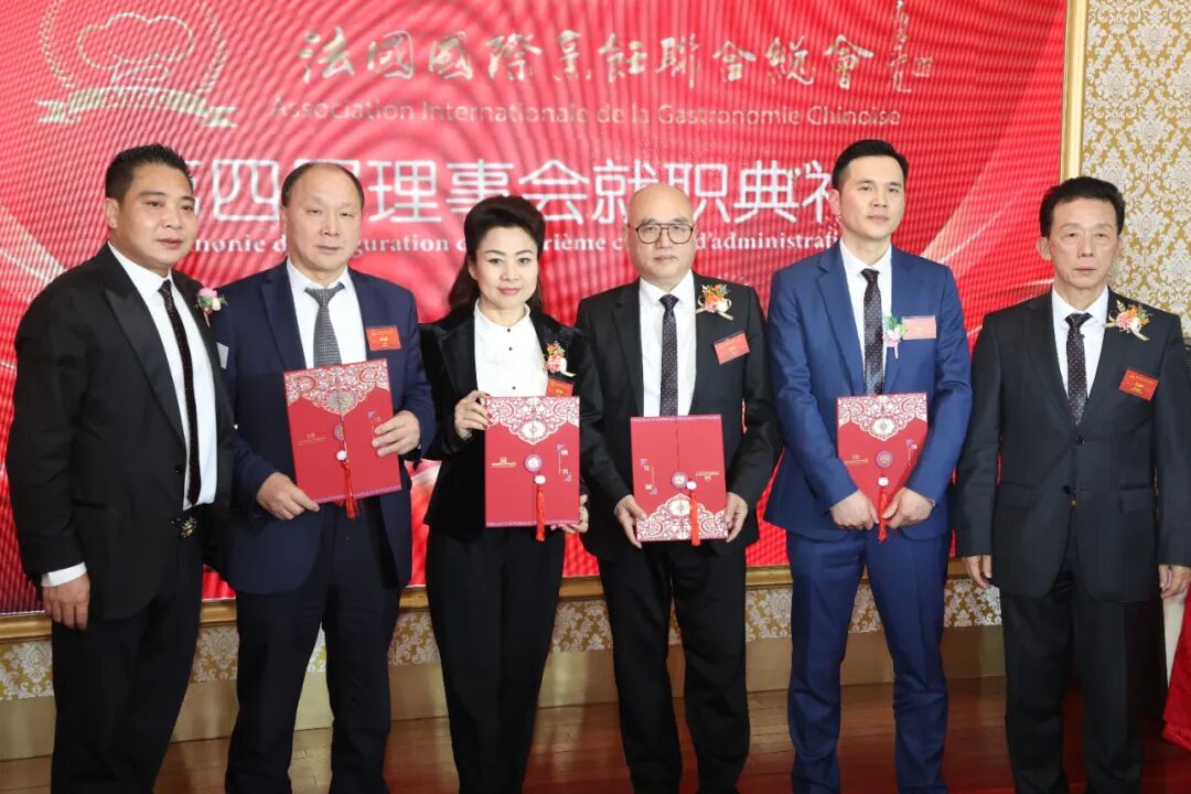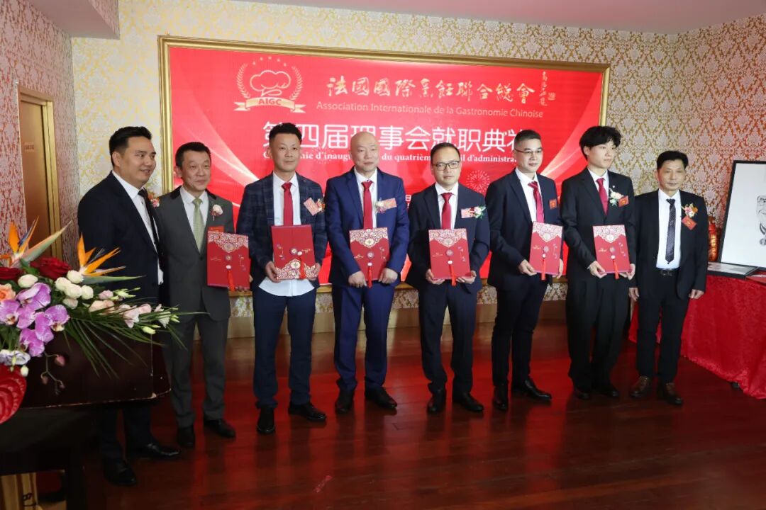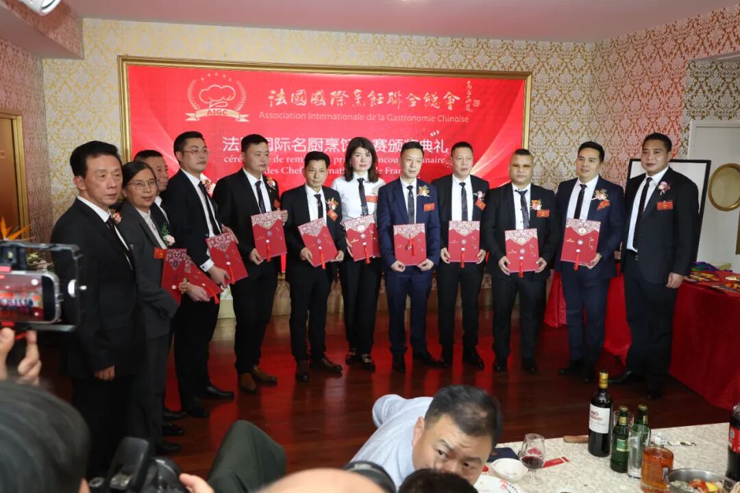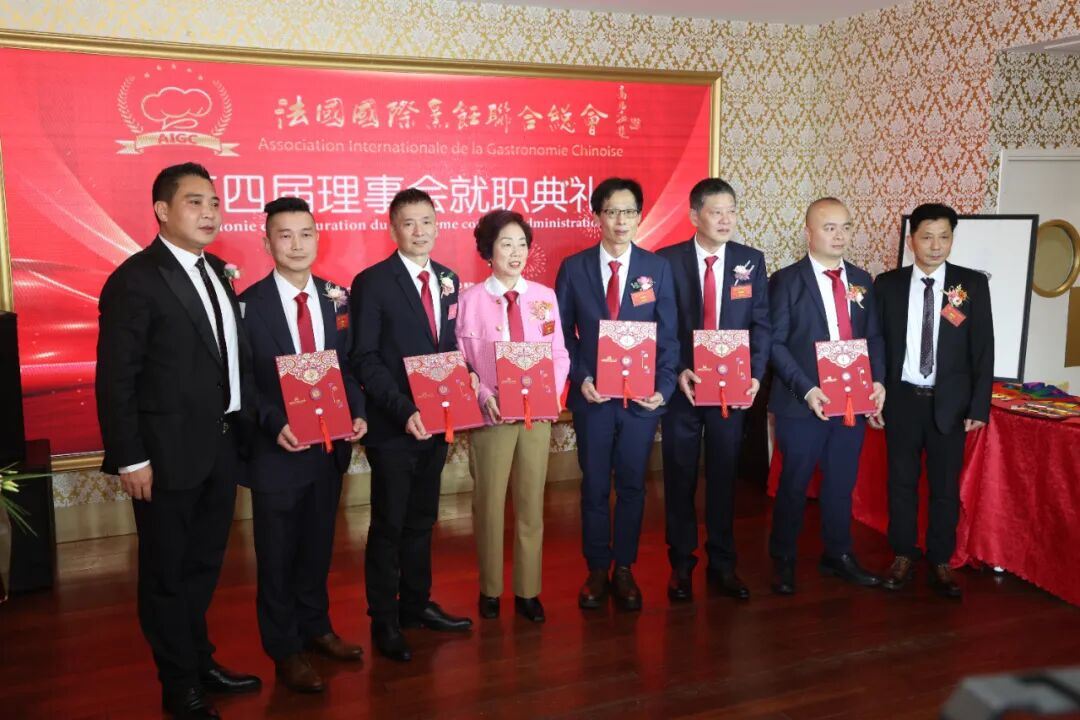 中国驻法国大使馆领侨处万磊参赞、法国国际烹饪联合总会创会主席王加清、法国国际烹饪联合总会第四届主席陈建斌,与出席活动的法国国际烹饪联合总会全体成员合影留念。