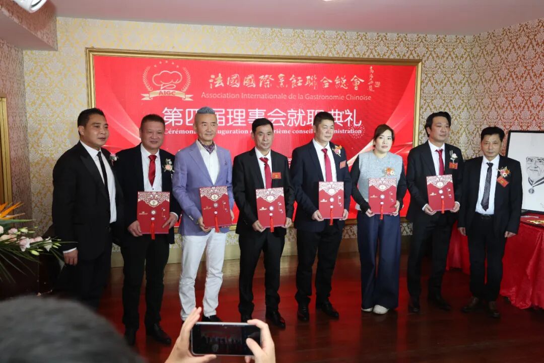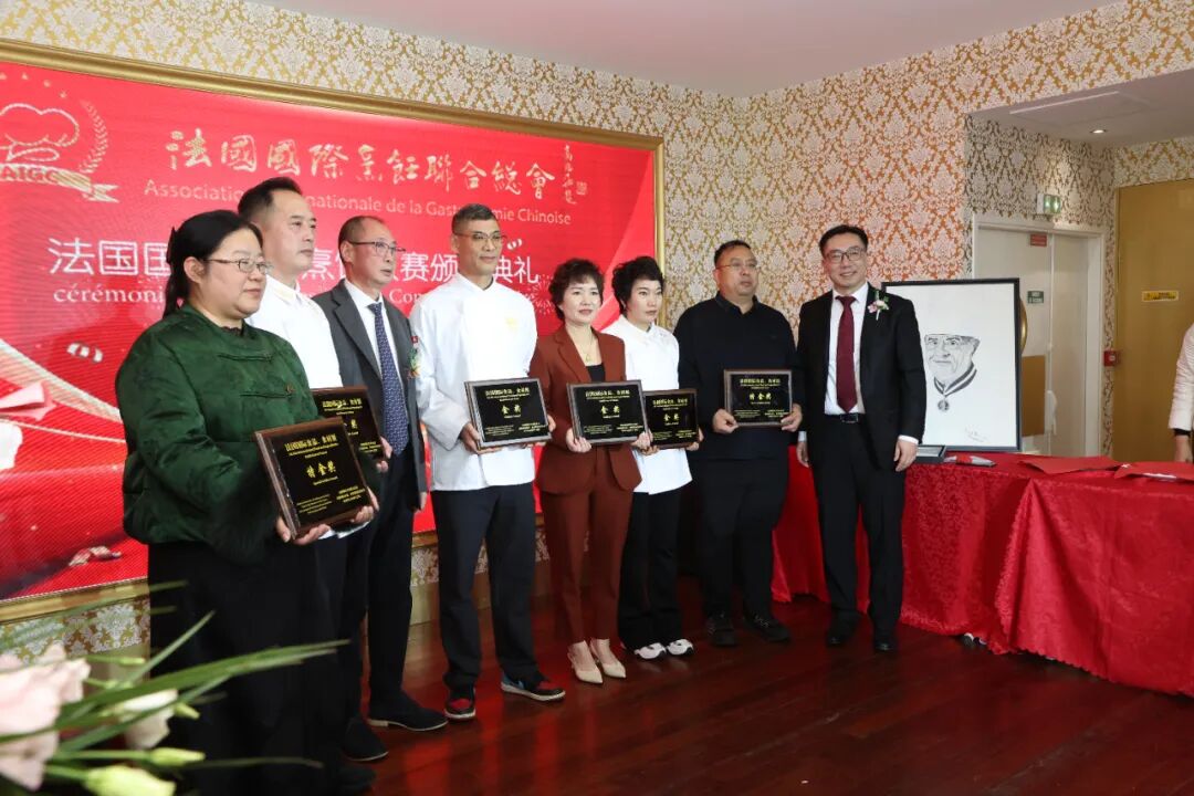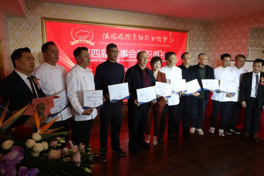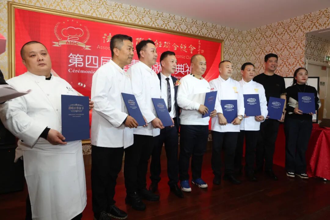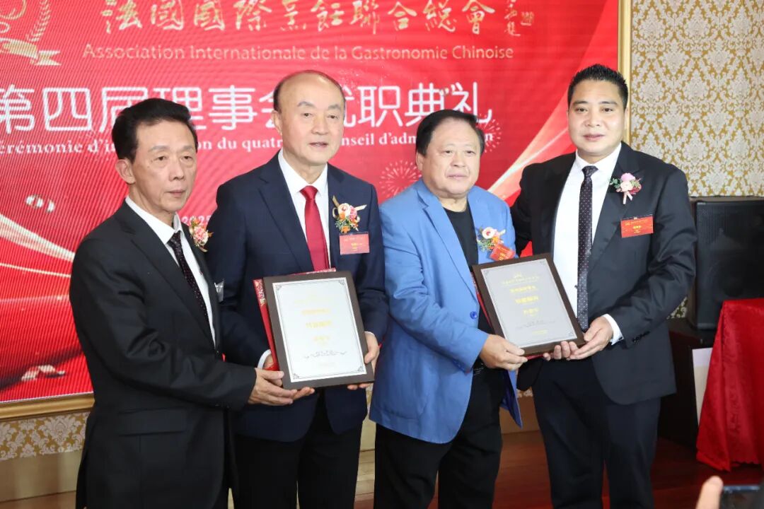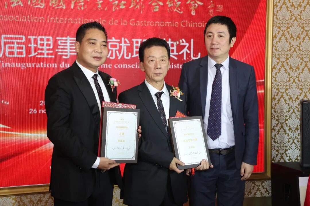 王加清陈建斌向法国国际烹饪联合总会第四届理事会核心成员颁发证书。