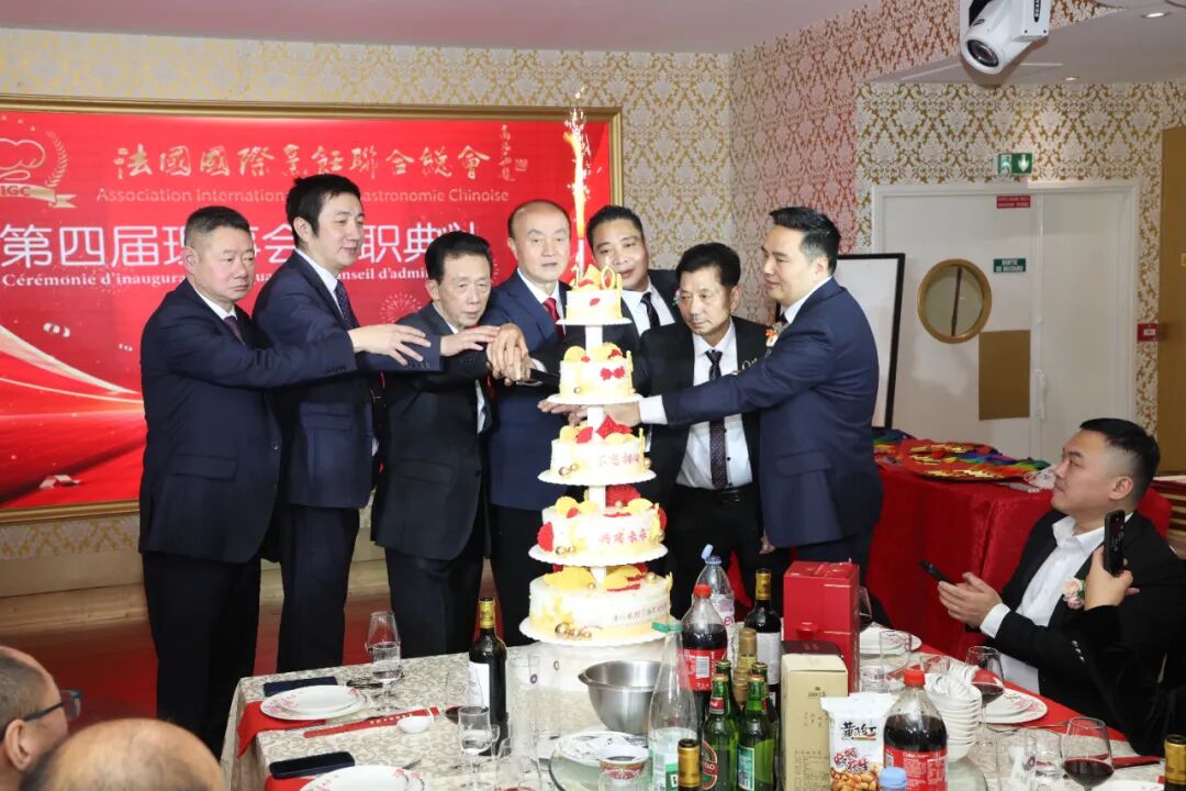 中国驻法国大使馆领侨处万磊参赞,中国厨师代表团团长高炳义,法国华侨华人会第一副主席丁仕定,法国国际烹饪联合总会创会主席王加清,法国国际烹饪联合总会第四届主席陈建斌,法国国际烹饪联合总会执行主席戴显奎,法国国际烹饪联合总会第一副主席林实,共同切下为庆祝法国国际烹饪联合总会成立十周年准备的蛋糕。