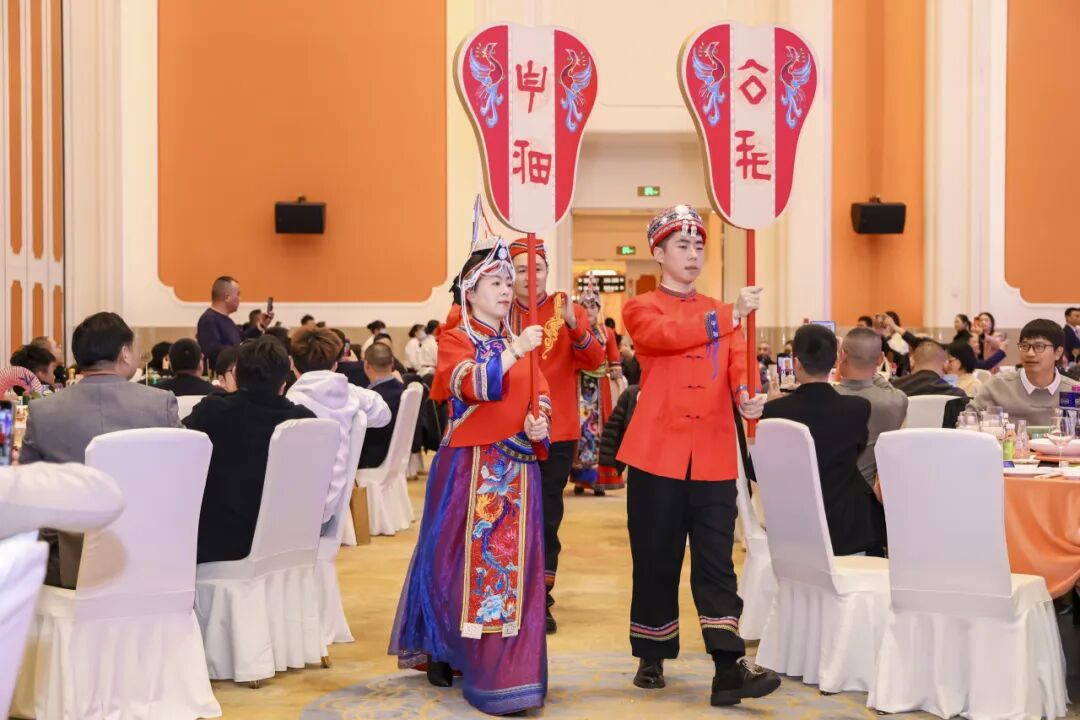 畲乡鸿宾大酒店团队的“上菜秀”开启了本场活动,其创意源于中国畲乡传统的“抬轿迎亲”习俗,将主菜“金针富足”置于特制“红轿”之中,在锣鼓喧天与光影交错的隆重氛围中登场,寓意协会新一届领导班子“闪亮登场”,并寄托了带领行业走向繁荣富足的美好愿景。