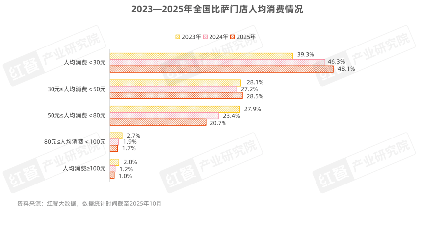 红餐大数据显示,截至2025年10月,人均消费在30元以下的比萨门店占比达48.1%,居于首位;其次是30-50元区间,门店数占比为28.5%;人均消费在50-80元区间的门店数占比也超过了20%;80元及以上的比萨门店占比则较少。