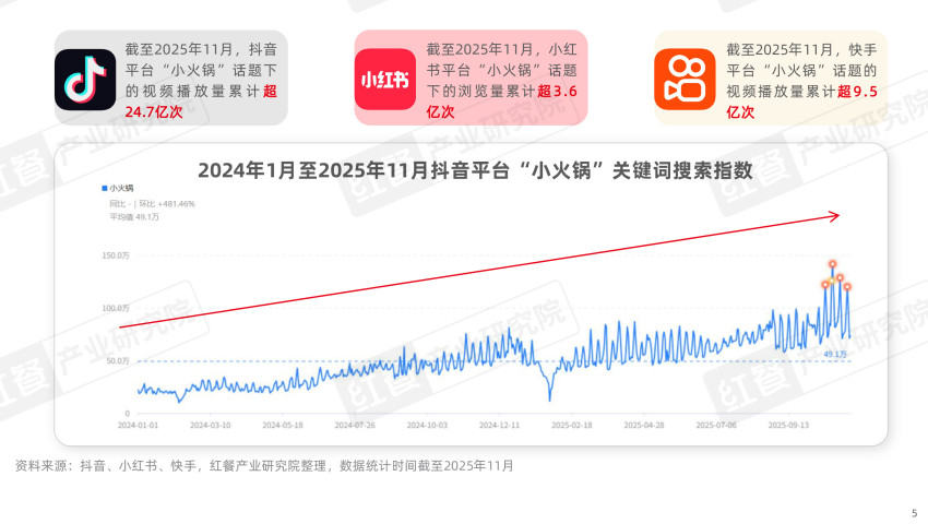 在巨量算数平台上,“小火锅”关键词搜索指数从2024年初的不到50万提升至2025年11月的150万左右。同时,在各个社交平台上,“小火锅”相关话题也获得了较高的热度。比如截至2025年11月,“小火锅”话题在小红书浏览量累计超3.6亿次,相关视频播放量在快手、抖音分别超9.5亿次和24.7亿次。