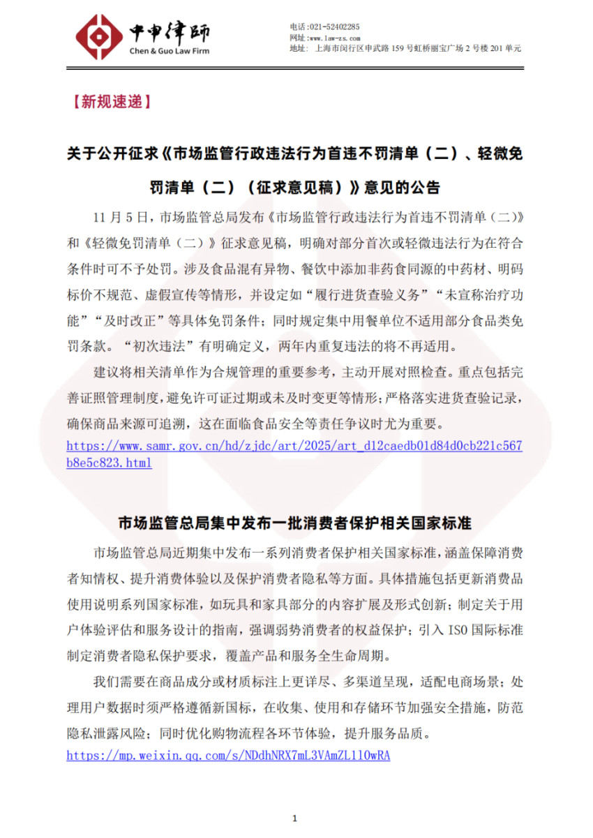 1.关于公开征求《市场监管行政违法行为首违不罚清单(二)、轻微免罚清单(二)(征求意见稿)》意见的公告