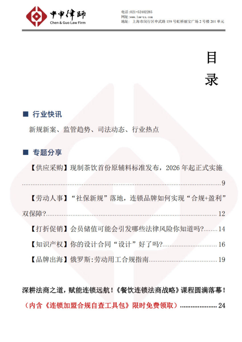 本刊内容涵盖真实且高价值的连锁法律咨询案例,同时持续追踪国家在连锁经营领域的新规新案、监管趋势、司法实践及行业热点,为品牌提供前瞻性、实用性的法律参考。