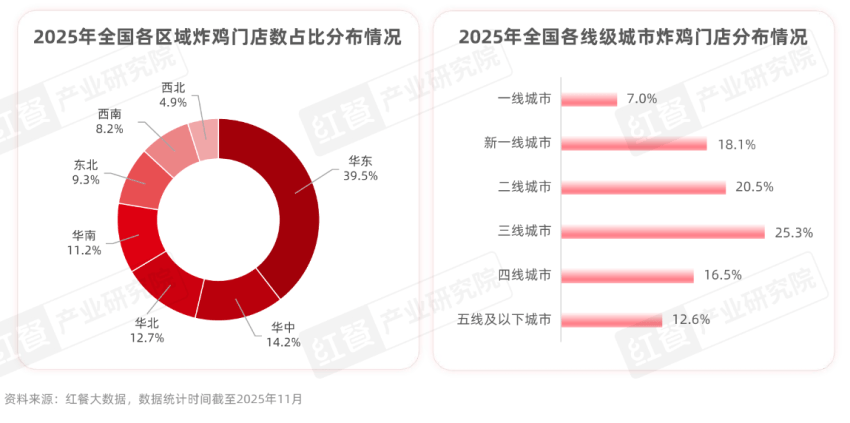 红餐大数据显示,从炸鸡门店的区域分布来看,华东地区占据了全国门店数将近四成的比例,而东北、西南和西北地区的门店数占比均不足10%;从线级城市分布来看,三线城市的炸鸡门店数最多,占比为25.3%,尽管三线及以下城市的炸鸡门店总占比54.4%,但相较于一线、新一线城市,下沉市场的炸鸡门店密度仍然较低。