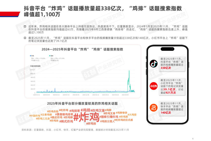 此外,在抖音、快手两大平台,“炸鸡”话题的视频播放量分别累计超过338亿次和140亿次;小红书平台上,“炸鸡”话题下的笔记浏览量更是高达39.1亿次,足见炸鸡这一美食在消费者心中的分量。