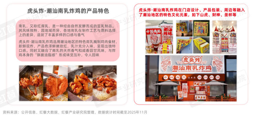红餐大数据显示,截至2025年11月,虎头炸・潮汕南乳炸鸡已在全国布局近500家门店,覆盖广东、广西、福建等70余座城市。仅2024年11月至2025年11月,虎头炸・潮汕南乳炸鸡就净增门店超300家,显示出强劲的扩张势能。