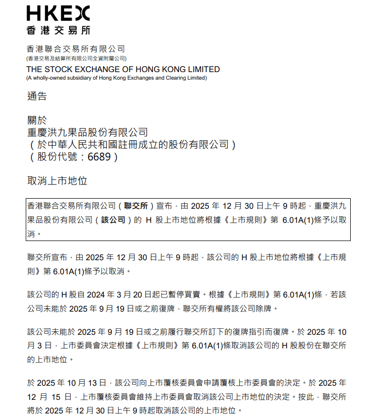 近日,香港联交所宣布,重庆洪九果品股份有限公司的H股上市地位将于12月30日上午9时起予以取消。