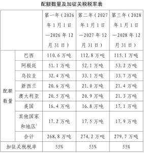 贸易商的紧张不是没有理由的。根据国别配额分配,2026年,巴西以110.6万吨居首,阿根廷、乌拉圭分别获得51.1万吨和32.4万吨,澳大利亚和新西兰各约20万吨,合计约268.8万吨。
