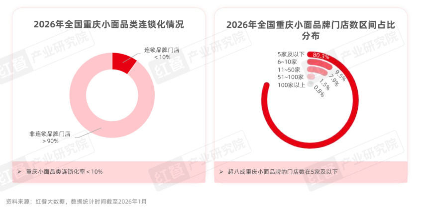 红餐大数据显示,截至2026年1月,重庆小面品类连锁化率不足10%。其中,80.3%的品牌门店数在5家及以下,而门店数在100家以上的品牌数占比仅为0.8%。这既反映出重庆小面赛道呈现高度分散的现状,同时也凸显出该品类未来在品牌化、连锁化升级方面具有较大的潜力空间。