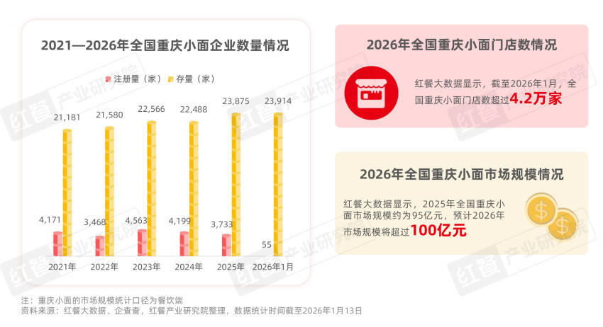 据企查查数据,截至2026年1月,全国重庆小面相关企业数量约2.4万家,较2024年年底增长6.3%。门店数量方面,红餐大数据显示,截至2026年1月,全国重庆小面门店数超过4.2万家,预计2026年重庆小面市场规模将有望突破百亿元。