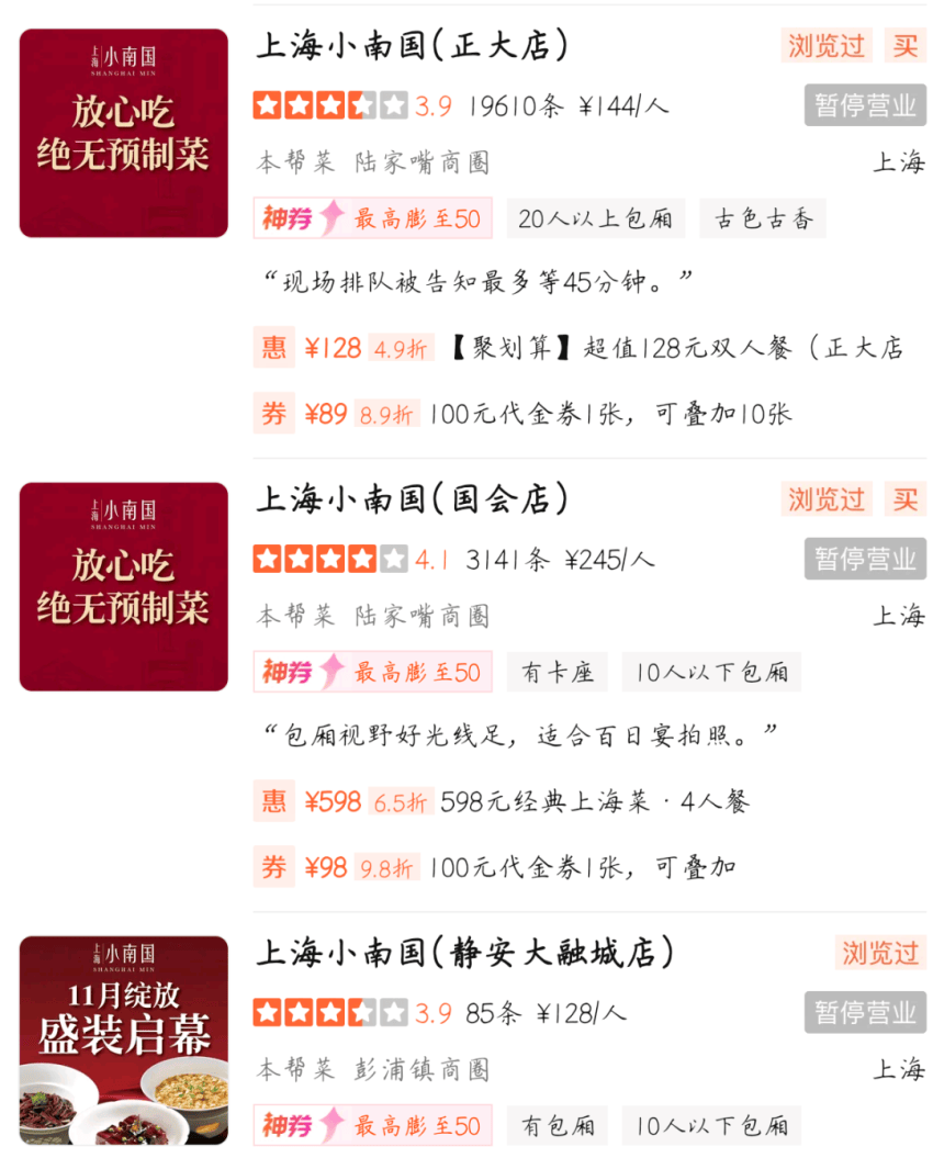 “小南国全关了,曾经上海人请客吃饭的排面啊。”