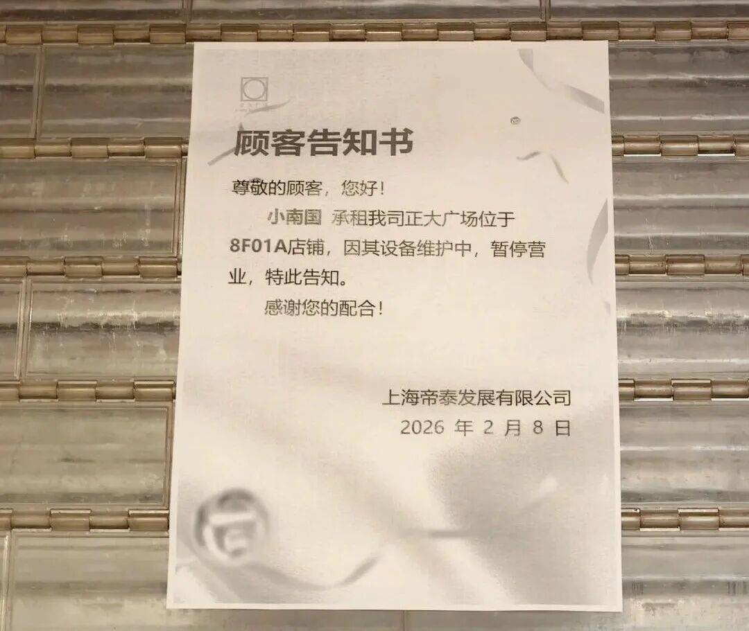 同样,在上海小南国金融街店,门外还立着“年夜饭火热预定中”的广告牌,门口同样贴着“设备调试,暂停营业”的告示。而商场公告表示:“小南国在未通知我司的情况下,于2026年2月6日起自行闭店。”