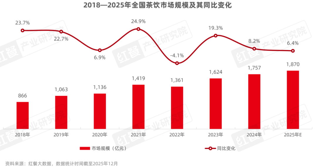 从遍地黄金到存量内卷,新茶饮赛道只用了短短几年。据红餐产业研究院测算,2025年全国茶饮市场规模预计达到1870亿元,同比增长6.4%,而2023年、2024年的增速分别为19.3%和8.2%,增长趋势已经明显放缓。