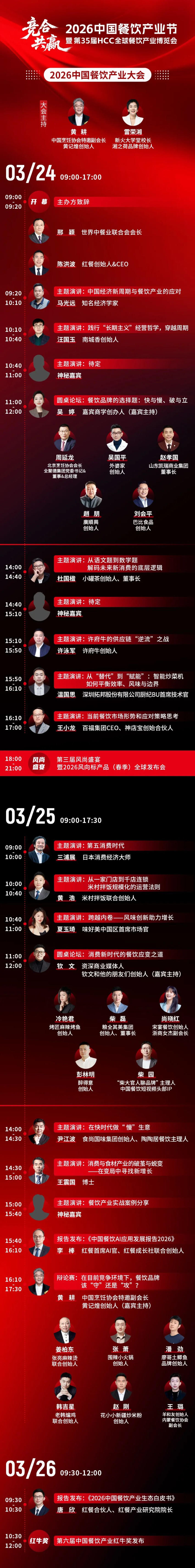 在此背景下,2026中国餐饮产业节暨第35届HCC全球餐饮产业博览会应运而生。本届产业节由世界中餐业联合会、红餐网联合主办,以“竞合·共赢”为主题,将于3月24-26日在杭州大会展中心举办。