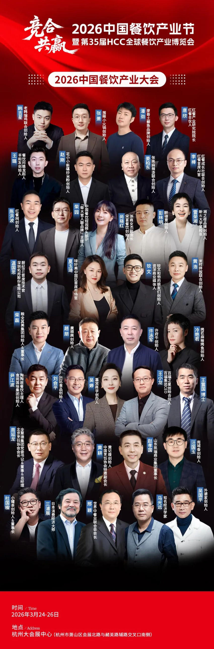 2026中国餐饮产业大会特邀餐饮产业各领域的影响力人物,涵盖食材供应、品牌运营、资本投资及数字化服务等,共同推动上下游资源高效协同,赋能餐饮产业转型升级,与广大餐饮创业者、管理者深度互动。