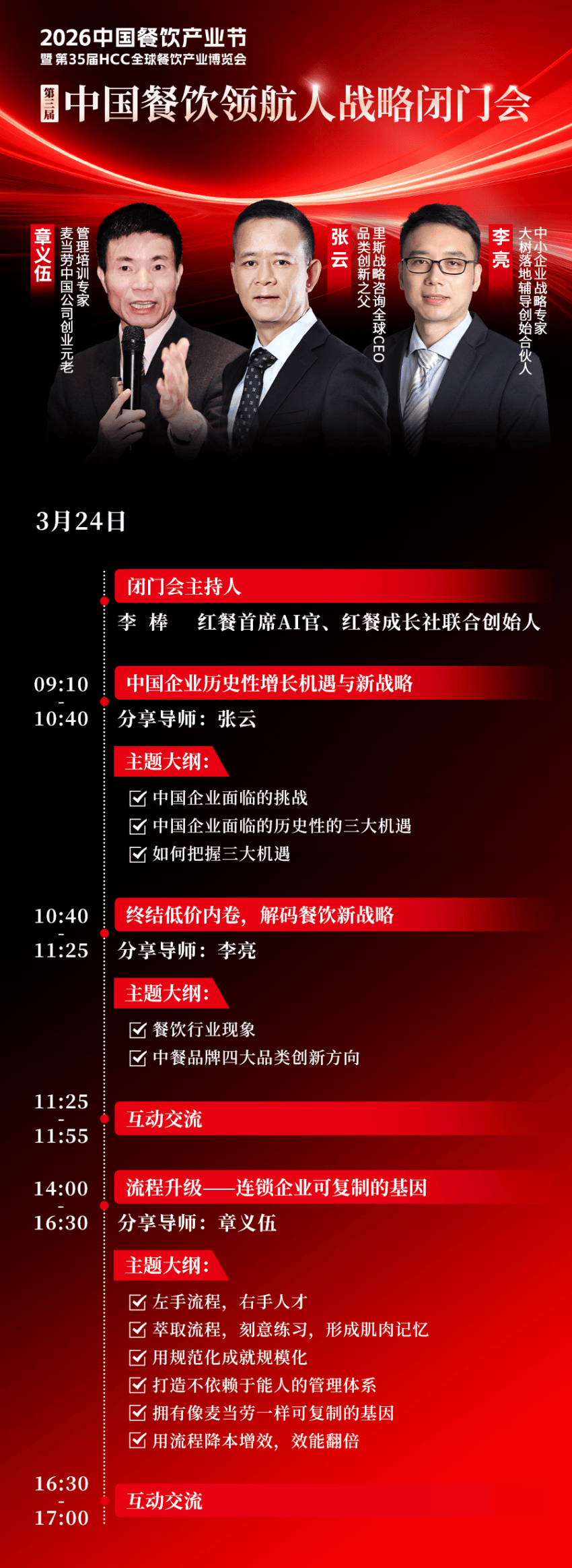 作为本届产业节的重磅板块,“第三届中国餐饮领航人战略闭门会”定于3月24日隆重举行,特邀品类创新之父、里斯战略咨询全球CEO张云、麦当劳中国公司创业元老章义伍、大树落地辅导创始合伙人、中小企业战略专家李亮,结合实战经验进行分享,助力餐饮企业应对挑战。同时定向邀请150位优秀餐饮连锁企业掌门人进行深度学习与交流。