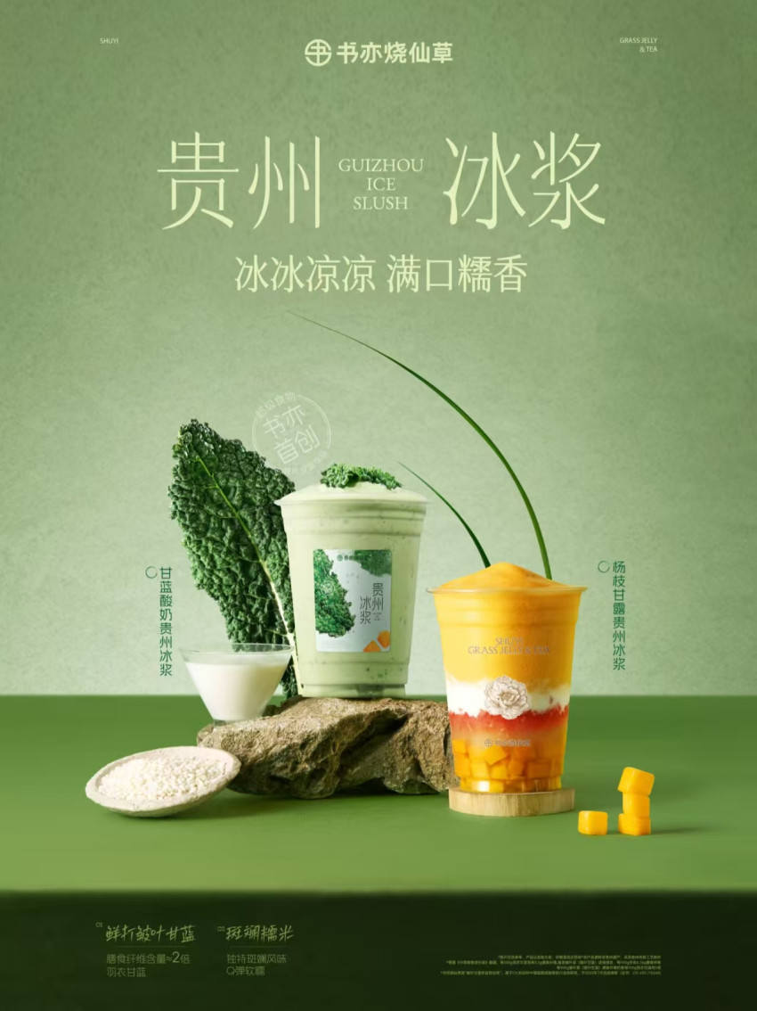 书亦烧仙草则以贵州传统冰浆为灵感,推出甘蓝2.0贵州冰浆系列,涵盖甘蓝酸奶贵州冰浆、杨枝甘露贵州冰浆两款饮品。该系列饮品以酸奶、轻牛乳为基底,融入贵州冰浆糯米,形成清新香糯、凉甜鲜弹的独特口感,打造出极具辨识度的地域特色风味。