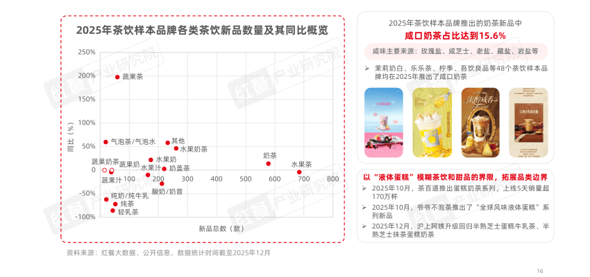 近日,红餐产业研究院发布了《茶饮品类发展报告2026》(以下简称《报告》)。报告显示,在2025年新茶饮样本品牌推出的奶茶新品中,咸口奶茶占比达到15.6%,多款产品掀起市场消费热潮。如茉莉奶白的抹茶咸乳酪系列、乐乐茶的咸法酪口味奶茶、柠季的泰式咸法酪等,均是咸口奶茶赛道的代表性产品。