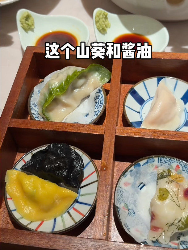 继限定生肖鲅鱼水饺之后,摆上博主餐桌的是一屉精致木盒,木盒内有白菜生蚝、海胆、墨鱼、黄花鱼、鲜花共五颗不同口味的水饺,形态精致且用料讲究。比如白菜生蚝水饺,包有整颗生蚝,绿花边搭配酱油、山葵,颇具日料感;另外颜值最亮眼的谢霆锋联名鲜花水饺,通体覆有花瓣,能尝到玫瑰、康乃馨、茴香须与墨鱼馅的融合风味。