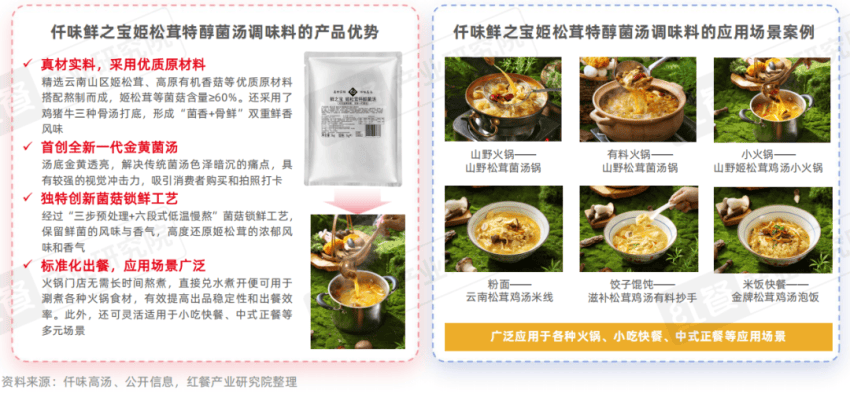针对菌汤的痛点,仟味高汤依托于全国30多位专业厨师、50余名研发人员的研发实力,深入云南野生菌产区,实地调研当地数十家野生菌火锅门店后,系统梳理了菌汤底料的原料筛选、熬制工艺、食材搭配等关键环节。经过长时间的研发与调试,仟味高汤推出了鲜之宝姬松茸特醇菌汤调味料。