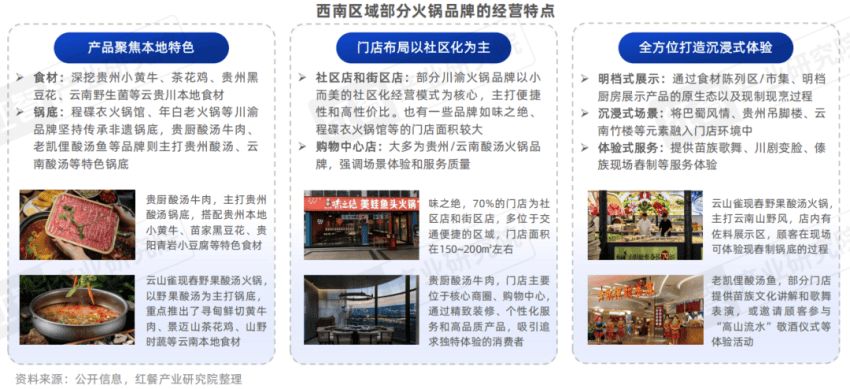 门店布局方面,大部分川渝火锅品牌的门店选址以社区店和街区店为主;还有一些新兴的酸汤火锅品牌则主要将门店开在购物中心,门店环境中融入了云贵地区的风俗文化。用餐体验方面,品牌主要是通过“明档式展示、沉浸式场景、体验式服务”的组合方式打造沉浸式体验,将“吃火锅" 升级为全方位的文化体验。
