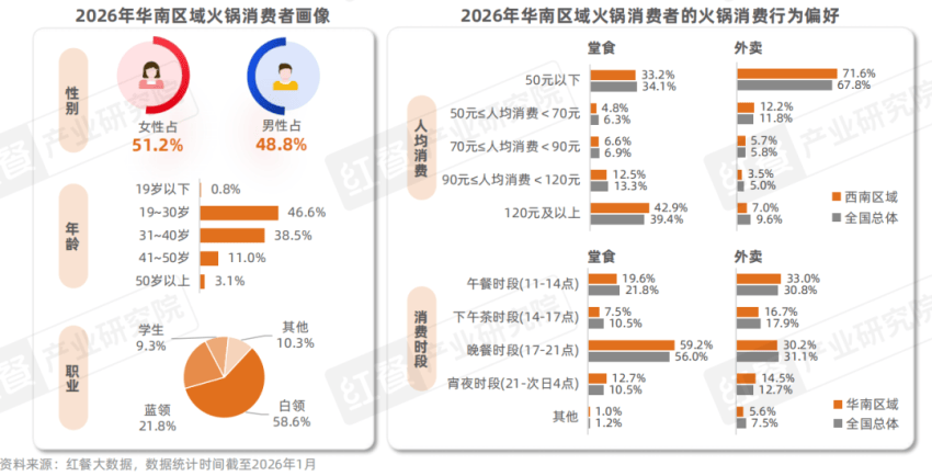 从华南区域的火锅消费者画像来看,与华东、西南区域的大体一致,仍以年轻群体、白领群体为主。