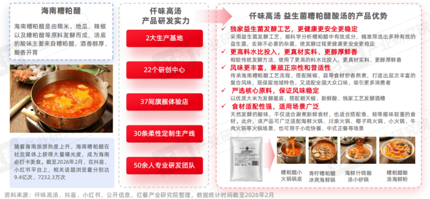 洞察到火锅品牌推出海南糟粕醋酸汤的痛点,深耕中式高汤领域的仟味高汤积极跟进品牌的需求。针对海南糟粕醋的痛点,仟味高汤凭借专业的研发团队,推出了益生菌糟粕醋酸汤。