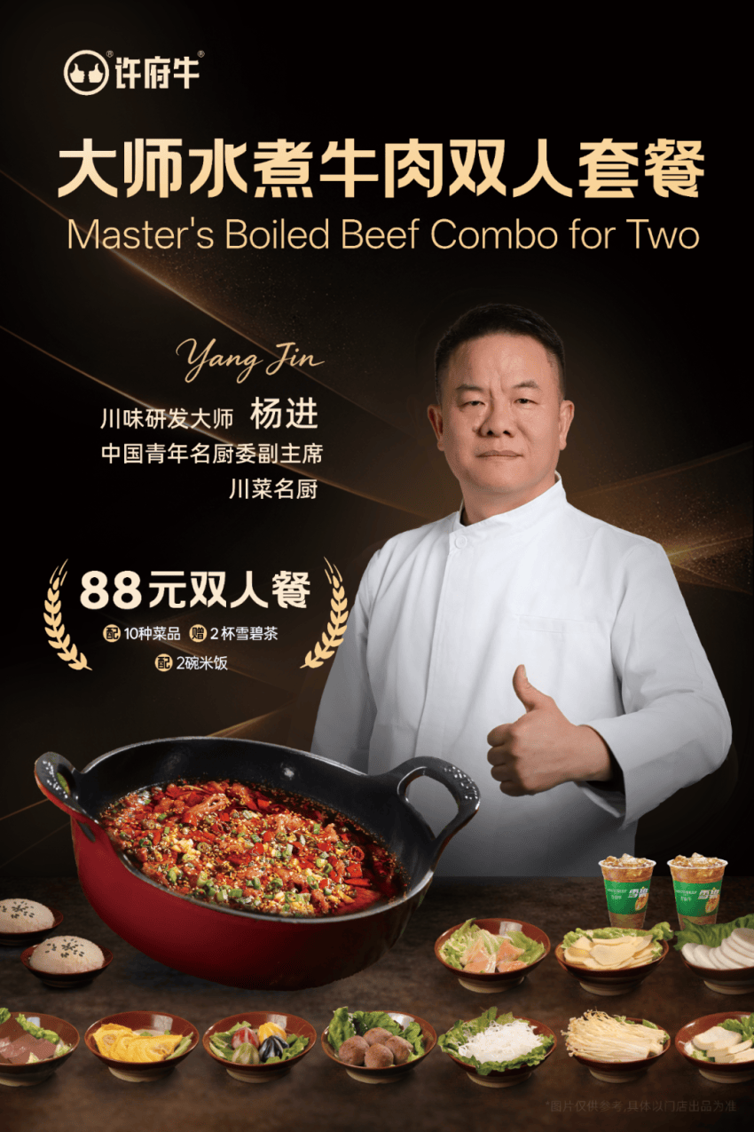 这款大师水煮牛肉套餐,是许府牛依托自身强大的牛肉供应链和研发实力,联合川味研发大师杨进为全国门店量身打造的产品。套餐中的锅底创新融合水煮牛肉这道经典川菜,入口后麻、辣、鲜、香层层递进,风味浓郁而富有层次感。