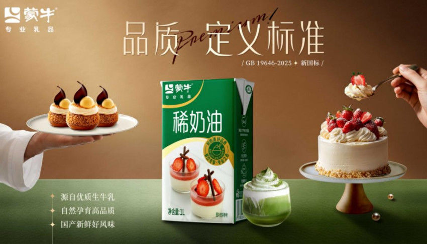 1. 蒙牛新国标稀奶油以优质生牛乳为核心原料,100%动物乳脂肪,符合国家GB19646-2025新标准。质地细腻、打发率高,拥有优异的稳定性和挺立度,是制作绵密稳定奶盖的理想之选,为茶饮、咖啡的顶层风味带来醇厚顺滑的质感。