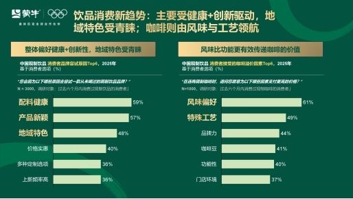在消费趋势方面,本报告指出,消费者整体偏好具备健康+创新属性的品牌(分别占比59%、57%),同时,我们惊喜地发现,“地域特色”饮品也受到青睐(占比48%);而在现制咖啡品类中,消费者或更强调味觉本身,因此更愿意为风味买单(占比61%),以手冲与冷萃为代表性的特殊工艺则紧随其后(占比49%)。