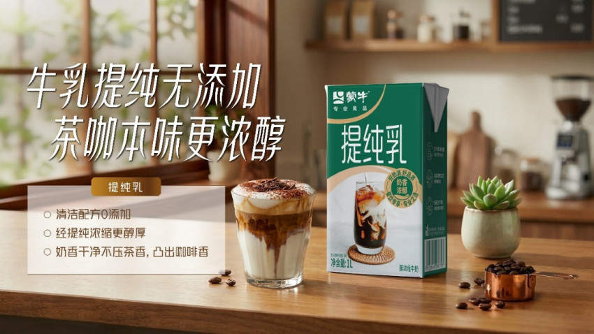 3. 蒙牛提纯乳主打“清洁标签 膜过滤提纯好口感”,配料仅有生牛乳,0添加。通过膜过滤工艺物理提纯浓缩,带来远超普通牛乳的醇厚口感。在咖啡应用中,纯净奶香不压咖啡风味,高乳脂与高蛋白带来丝滑融合表现,成为现制饮品,特别是精品咖啡出品的理想乳基底。