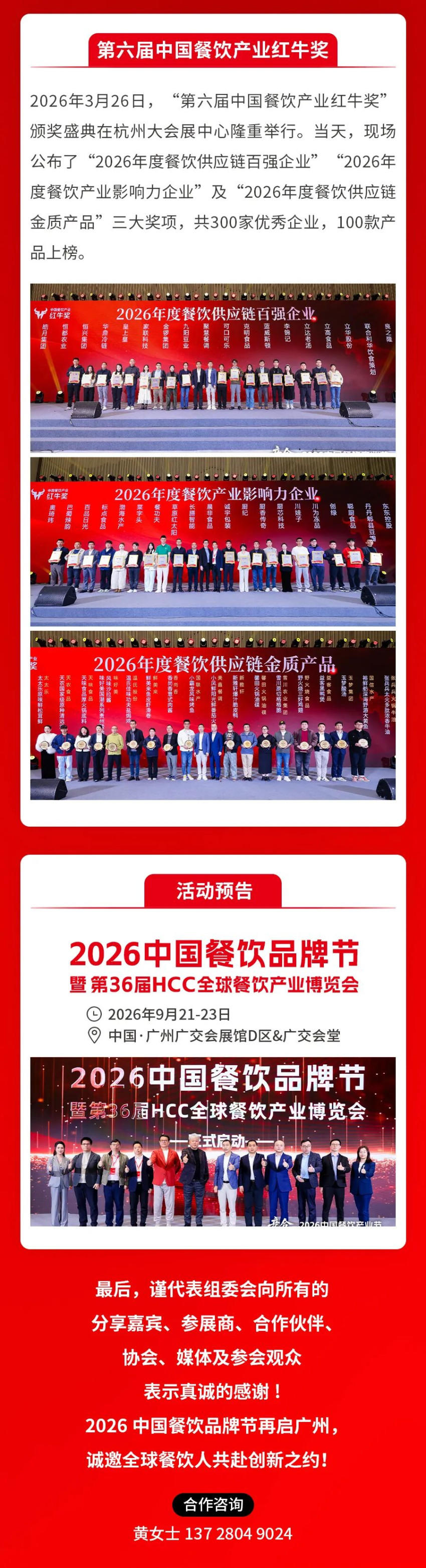 3月24-26日,为期三天的“2026中国餐饮产业节暨第35届HCC全球餐饮产业博览会”在杭州大会展中心圆满落幕!