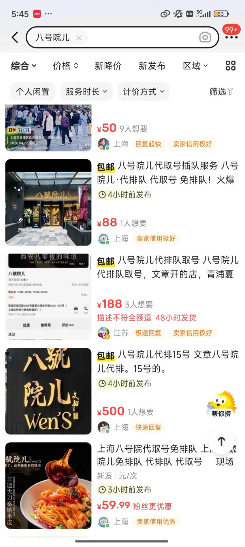 也正是凭借这样的高性价比,该门自开业起每天都长队不断。社交平台上,有网友反馈,排队整整五个小时才终于进店落座。更为夸张的是,闲鱼平台上已经出现了该门店的黄牛代排服务,最高价格甚至炒到了500元。