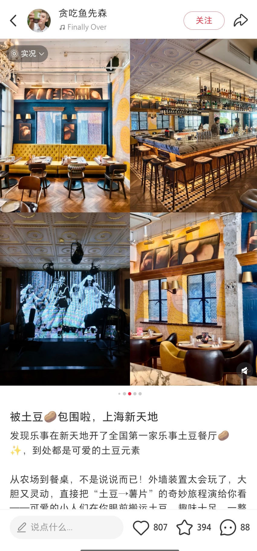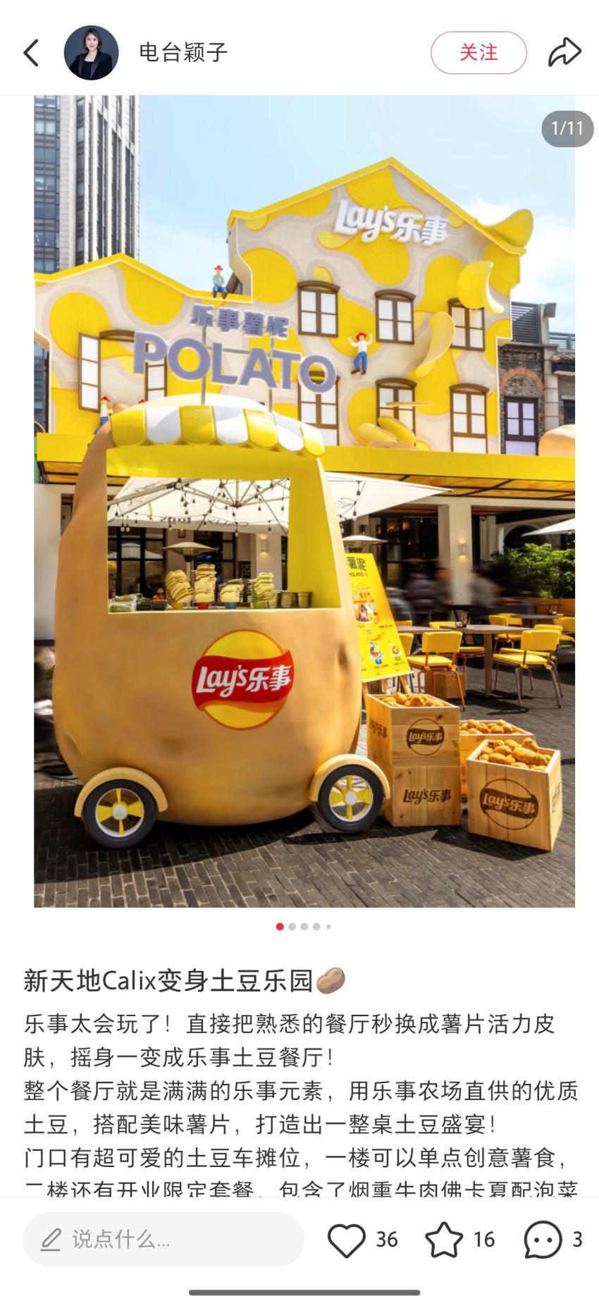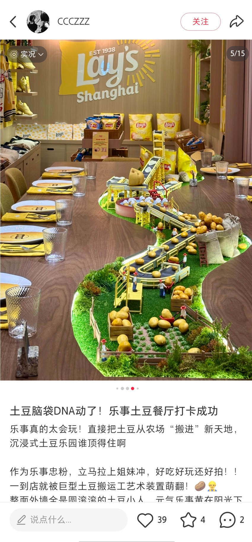 一方面,消费者在用餐、打卡、购物的过程中,能够通过其空间装饰、菜品设计、周边体验等具象化的形式更加立体地感受品牌理念,从而固化品牌心智,提升品牌认可度与用户黏性;另一方面,乐事通过开土豆主题餐厅,能够借助年轻群体的社交传播持续扩大声量,不断吸引消费客流。