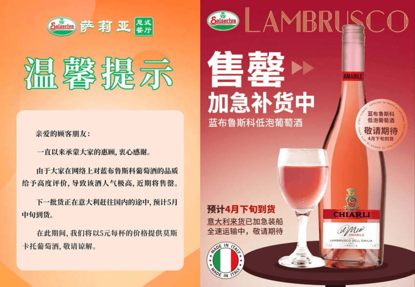 目前,上海萨莉亚官方则已发布公告称,蓝布鲁斯科葡萄酒已全店补货,同时,广东及上海门店分别推出了5元及6元一杯葡萄酒的优惠活动,进一步带动了消费者到店尝鲜其他酒饮的热情。不过,萨莉亚门店的酒类SKU并不算多,约7-8款,以红白葡萄酒为主,品类相对单一,价格则仍然走性价比路线,750ml规格的各类葡萄酒售价均在36元-58元这一区间,受到不少消费者青睐。
