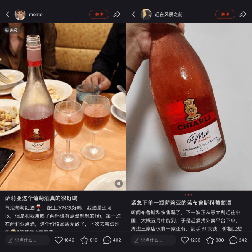 据红餐网观察,在电商平台,一瓶750ml的蓝布鲁斯科葡萄酒售价通常在50-100元之间。这也不难看出为何消费者会疯抢了。