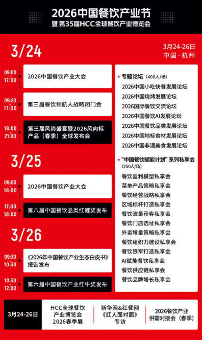 作为2026中国餐饮产业节暨第35届HCC全球餐饮产业博览会的重要版块,HCC全球餐饮产业博览会·2026春季展将于3月24-26日在杭州盛大开启,期待与您相约!