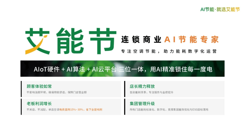 上海艾能节智能科技有限公司专注为连锁餐饮提供AI空调节能服务。通过“AIoT硬件+AI算法+AI平台”三位一体方案,实现单店空调节能15%~30%,在确保门店舒适体验的同时,减轻员工管理负担、提升运营效率,助力企业构建绿色商业生态。创新的按效果付费模式,让企业零门槛、零风险拥抱AI节能,让每一度电都创造更高价值。