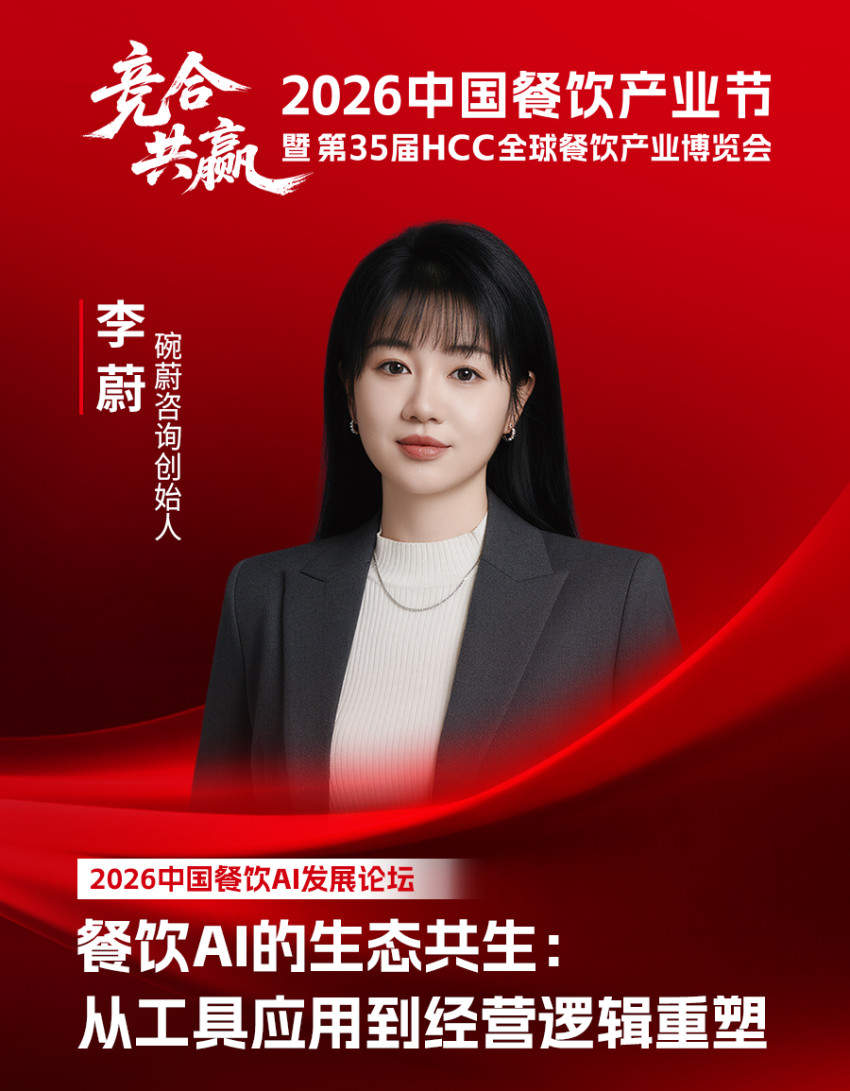 目前,碗蔚咨询创始人李蔚确认出席2026中国餐饮AI发展论坛,届时将在圆桌对话环节,就“餐饮 AI 的生态共生:从工具应用到经营逻辑重塑”议题,与餐饮品牌创始人及产业上下游领军人物,共研行业发展新路径,为餐饮产业高质量发展凝聚新动能。
