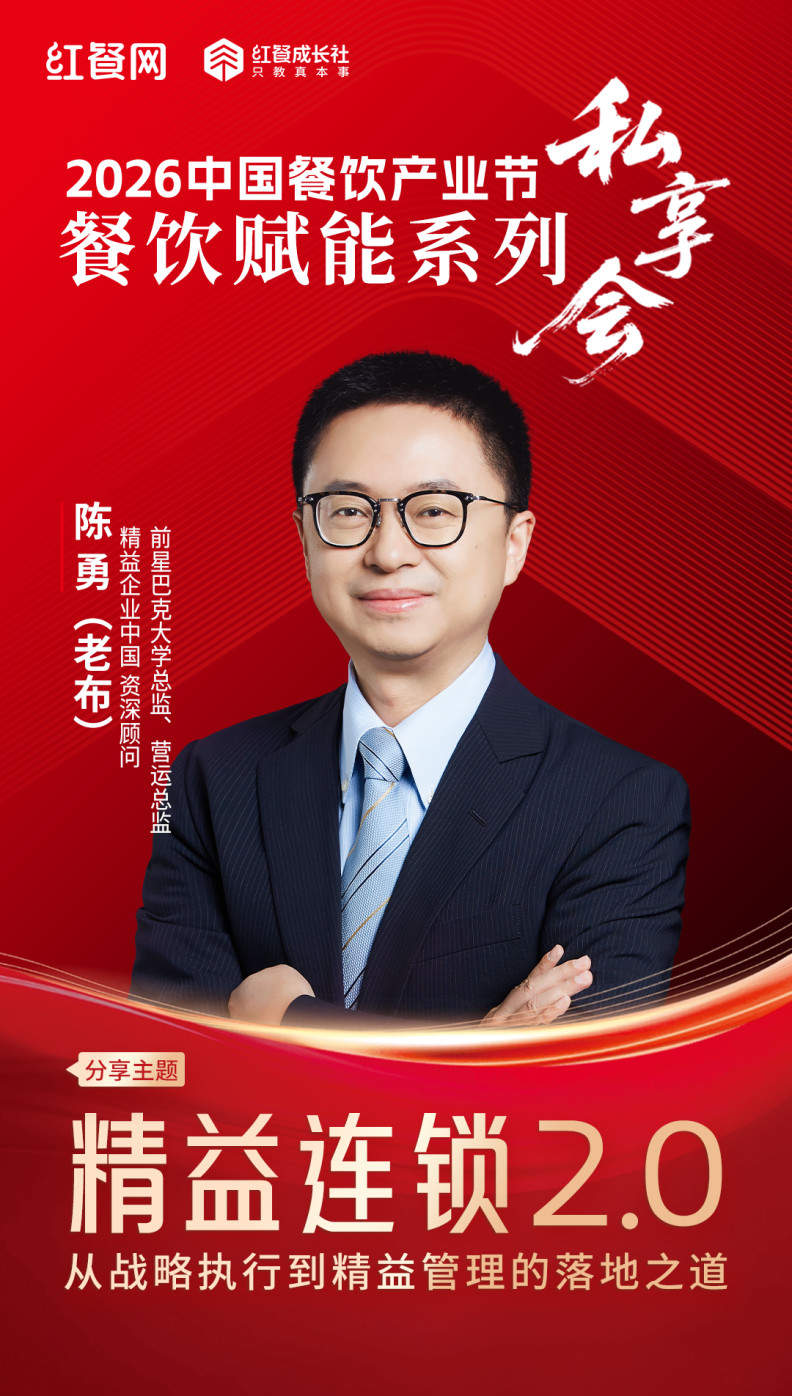 目前,精益企业中国资深顾问 陈勇(老布)确认出席2026中国餐饮产业节餐饮赋能系列私享会,届时将于3月25日上午09:00-12:00,在私享会B区(会议厅1-101B)就《精益连锁2.0: